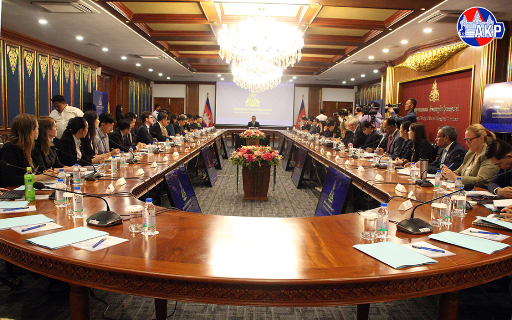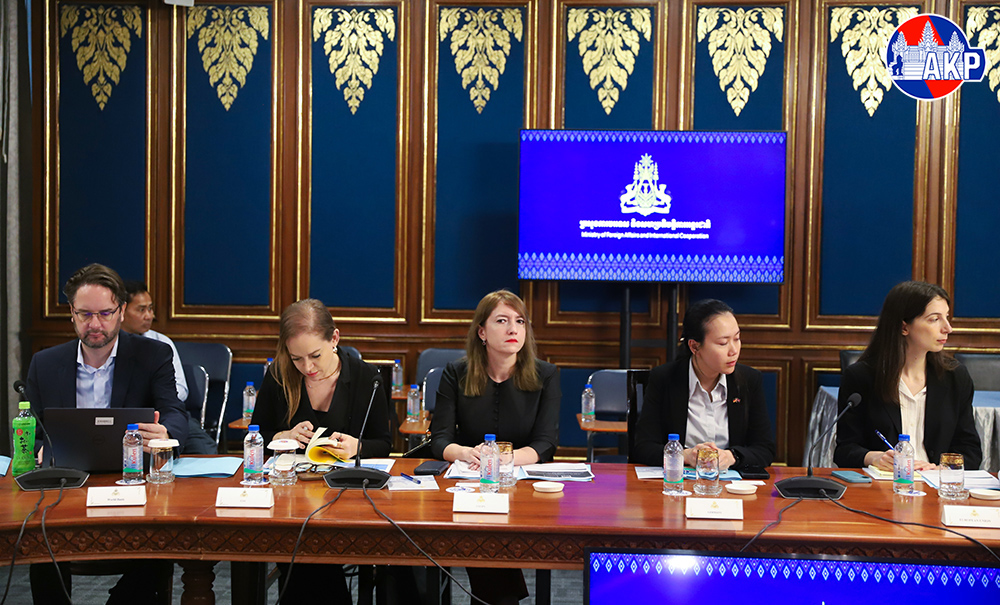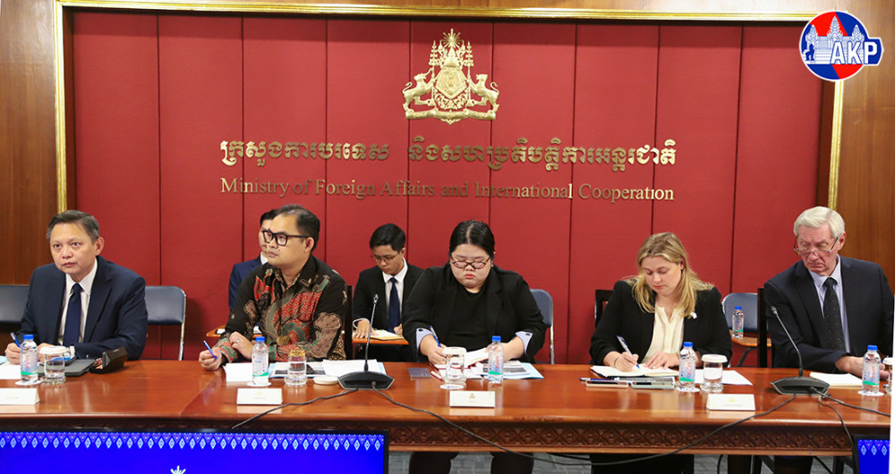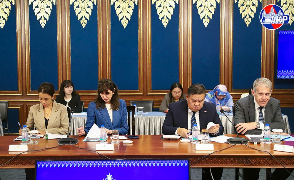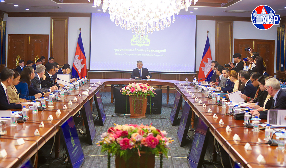 H.E. Santepundit Chhay Sinarith (Pic. 1), Senior Minister and Head of the Secretariat of the Commission for Combating Online Scams (CCOS), delivers a presentation to 28 ambassadors and representatives of nine international organisations accredited to Cambodia on the Law on Combating Technology-enabled Scams, at the Ministry of Foreign Affairs and International Cooperation in Phnom Penh this morning.