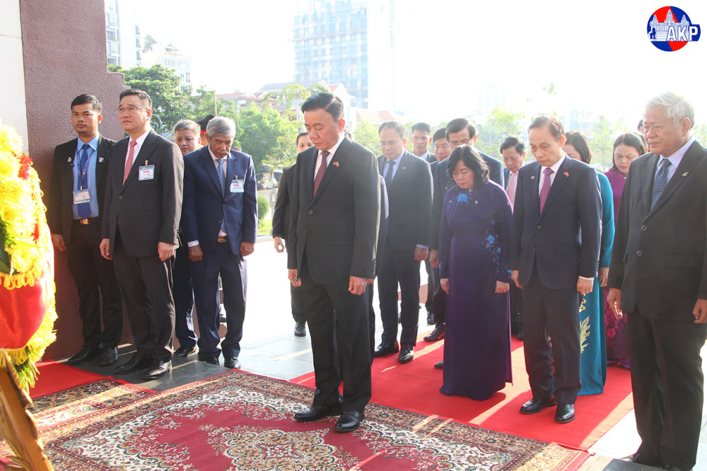 H.E. Tran Cam Tu, Member of the Politburo and Permanent Member of the Secretariat of the Communist Party of Vietnam (CPV) Central Committee, lays a wreath and pays tribute to Royal Statue of the late King-Father Samdech Preah Norodom Sihanouk (Preah Borom Ratanak Kaudh) in Phnom Penh this morning, as part of his two-day (April 9-10) official visit to the Kingdom of Cambodia.