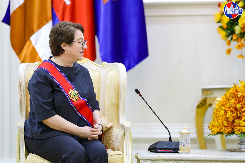 Prime Minister Samdech Moha Borvor Thipadei Hun Manet (R, Pic. 1) poses for a photo with visiting H.E. Ms. Ülkü Kocaefe, outgoing Ambassador of the Republic of Türkiye to the Kingdom of Cambodia, prior to their farewell meeting at the Peace Palace in Phnom Penh this morning.
