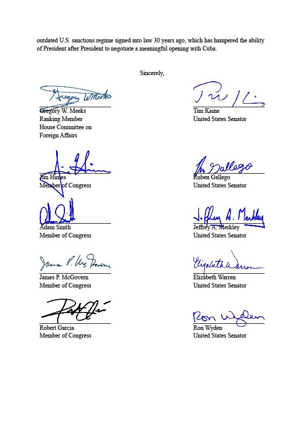 The letter is led by Gregory Meeks, Ranking Member of the House Foreign Affairs Committee, and Senator Tim Kaine, Ranking Member of the Senate Foreign Relations Subcommittee on the Western Hemisphere. In the document, the legislators emphasize the need to review current measures, which they describe as harmful and counterproductive.