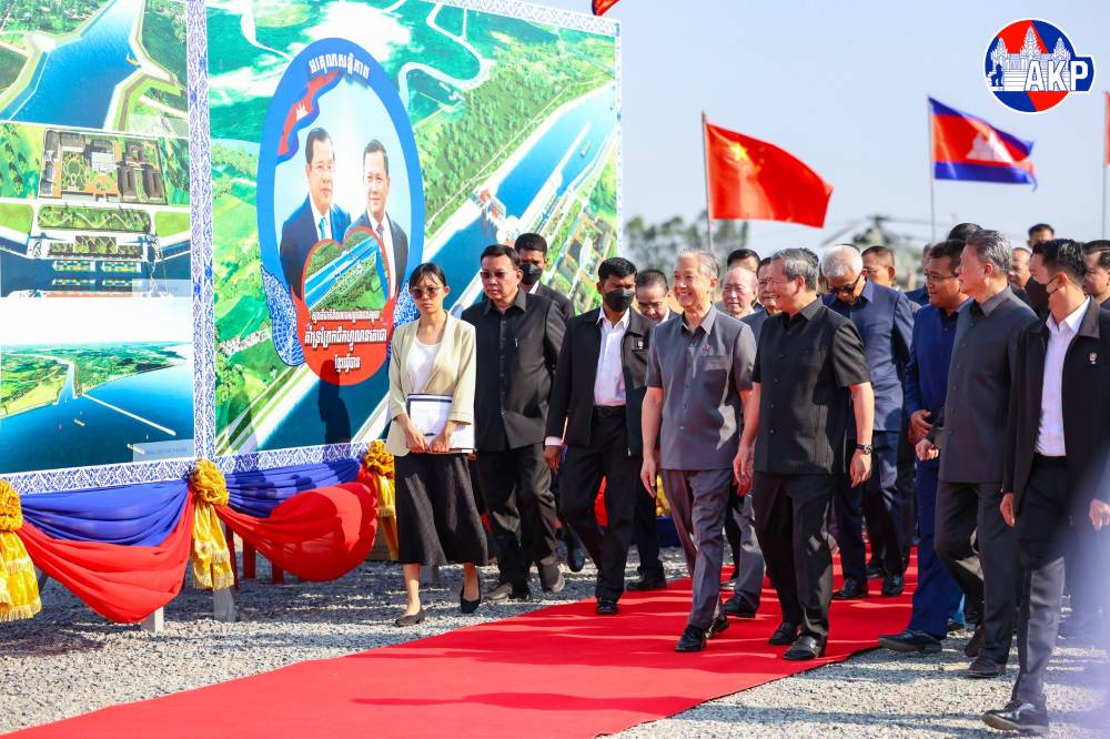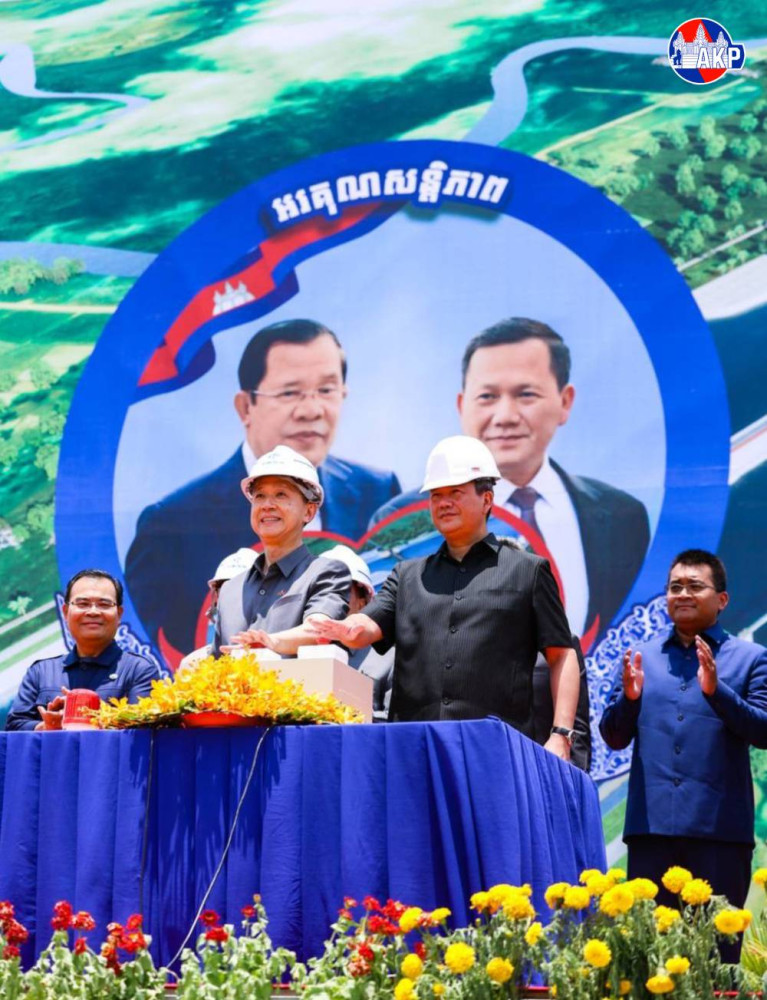 Cambodian Prime Minister Samdech Moha Borvor Thipadei Hun Manet (Pic. 1) addresses the participants while he and Chinese Ambassador to Cambodia H.E. Wang Wenbin were presiding over the groundbreaking ceremony for the construction of Funan Techo Integrated Water Resources Management Project – Section II spanning 151.6 kilometres from Prek Po, Kandal province, to the sea in Kep province. The ceremony was held this morning in Borey Chulsa district, Takeo province.