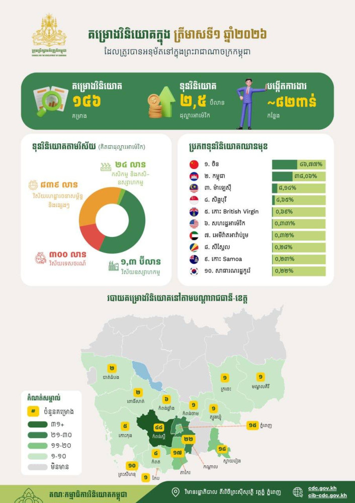 Cambodia has seen a remarkable surge in the investment landscape, attracting 146 fixed-asset investments with a total investment capital of US$2.5 billion in the first quarter (Q1) of 2026, creating over 82,000 jobs, according to a report from the Council for the Development (CDC) issued on April 13.