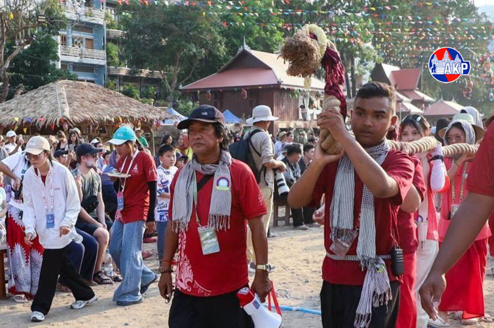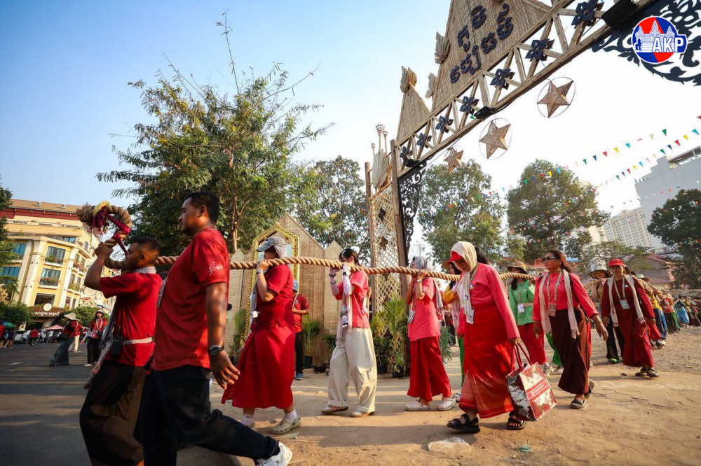 A 250-metre ceremonial tug-of-war rope is paraded this afternoon from the Nokor Sankranta Cultural Village toward the “Nokor Sankranta Friendship Tug-of-War” competition site along the Chaktomuk Walk Street, as part of celebrations marking the Khmer Traditional New Year, Year of Horse.