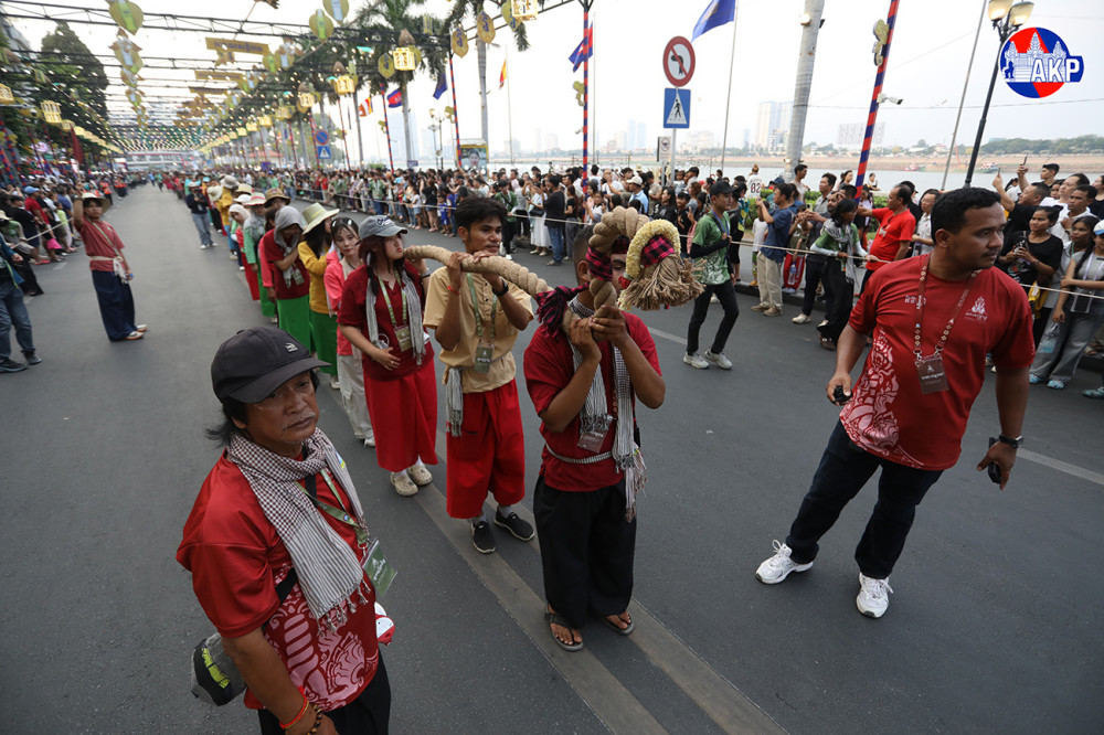 H.E. Hun Many (1st L, Pic. 1), Deputy Prime Minister, Minister of Civil Service, and President of the Union of Youth Federations of Cambodia (UYFC), joins the Nokor Sankranta Friendship Tug-of-War along the Chaktomuk Walk Street this evening. The 250-metre contest is held in celebration of the Traditional Khmer New Year, Year of the Horse.
