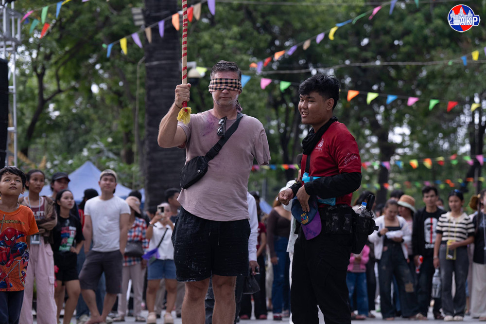 National and international tourists enjoy clay pot-hitting game (Veay K-om), one of the most popular folk games, at Wat Phnom Historical Site on April 15, the 2nd day of Khmer New Year festival.