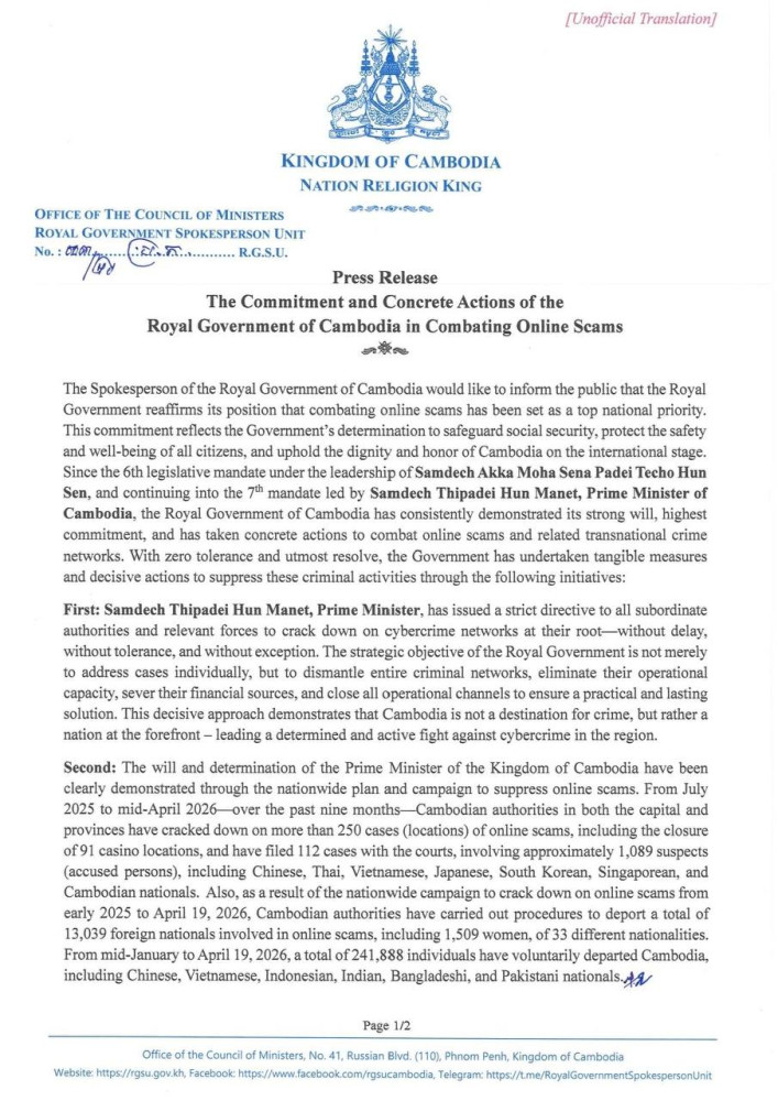 Royal Government’s Commitment and Concrete Actions in Combating Online Scams Highlighted