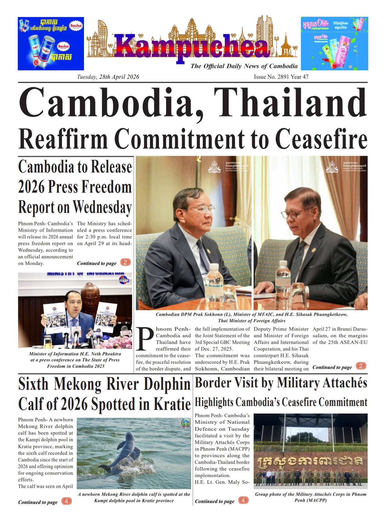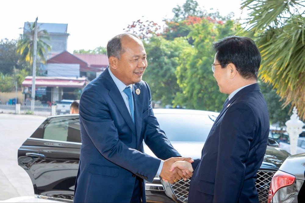H.E. Abhisantibindit Sar Sokha (R, Pic. 1), Deputy Prime Minister and Minister of the Ministry of Interior, poses for a photo with Mr. Okubo Hideo, Chairman and CEO of the Tokyo-based FORVAL CORPORATION, prior to their meeting at the Ministry of Interior, Phnom Penh, this afternoon.
