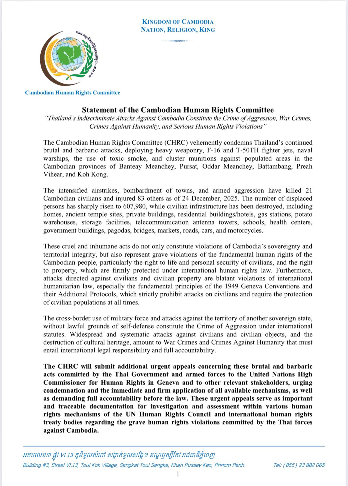 AKP Phnom Penh, December 24, 2025 -- Attacks using weapons against civilians and civilian property are not acceptable under international law. The acts of violence alleged to have occurred—including attacks on civilians, schools, pagodas, ancient temples, and private...