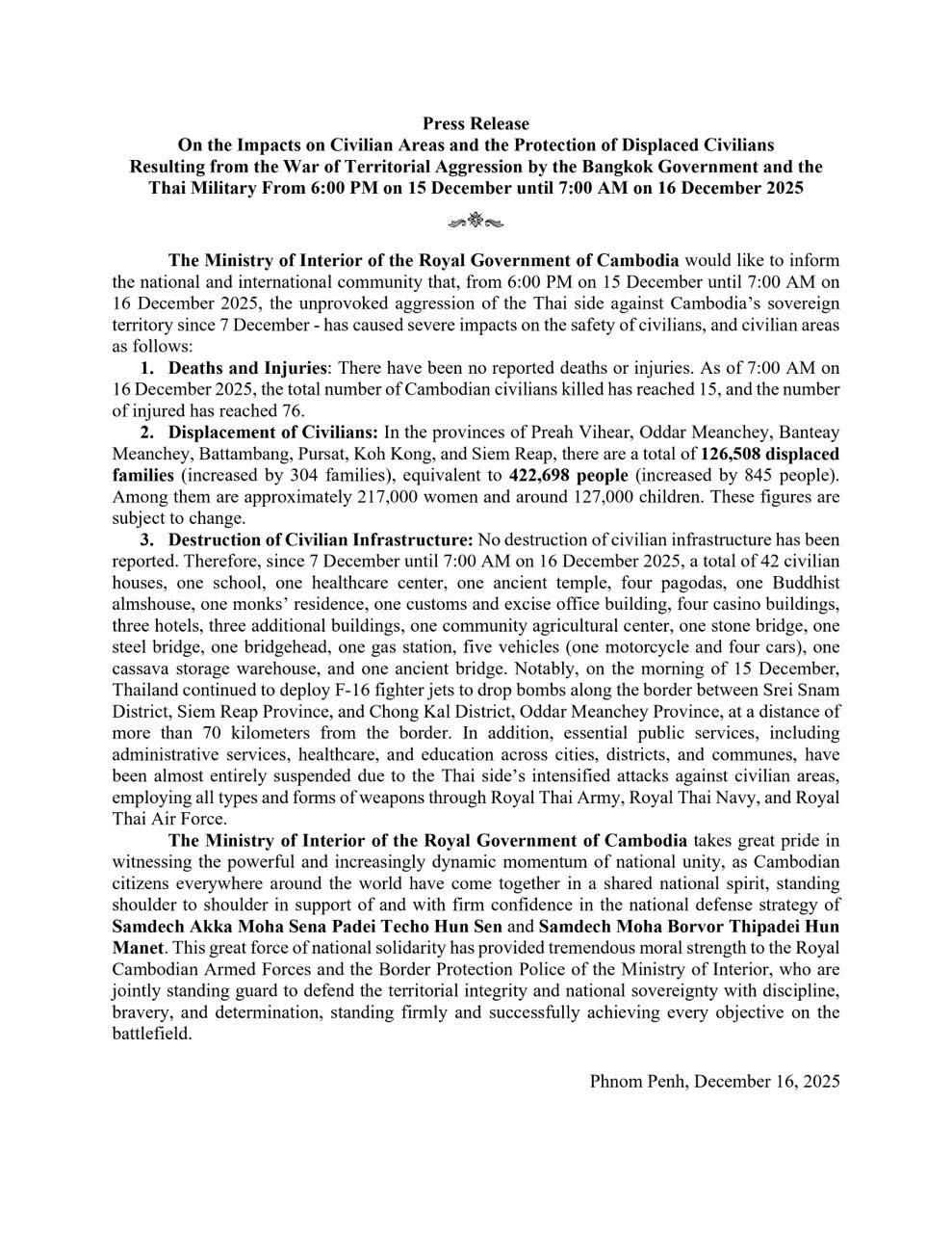 AKP Phnom Penh, December 16, 2025 -- The Ministry of Interior of the Royal Government of Cambodia this morning updated the public on the impacts on civilian areas and the protection of displaced civilians resulting from the war of territorial aggression by the Bangko...