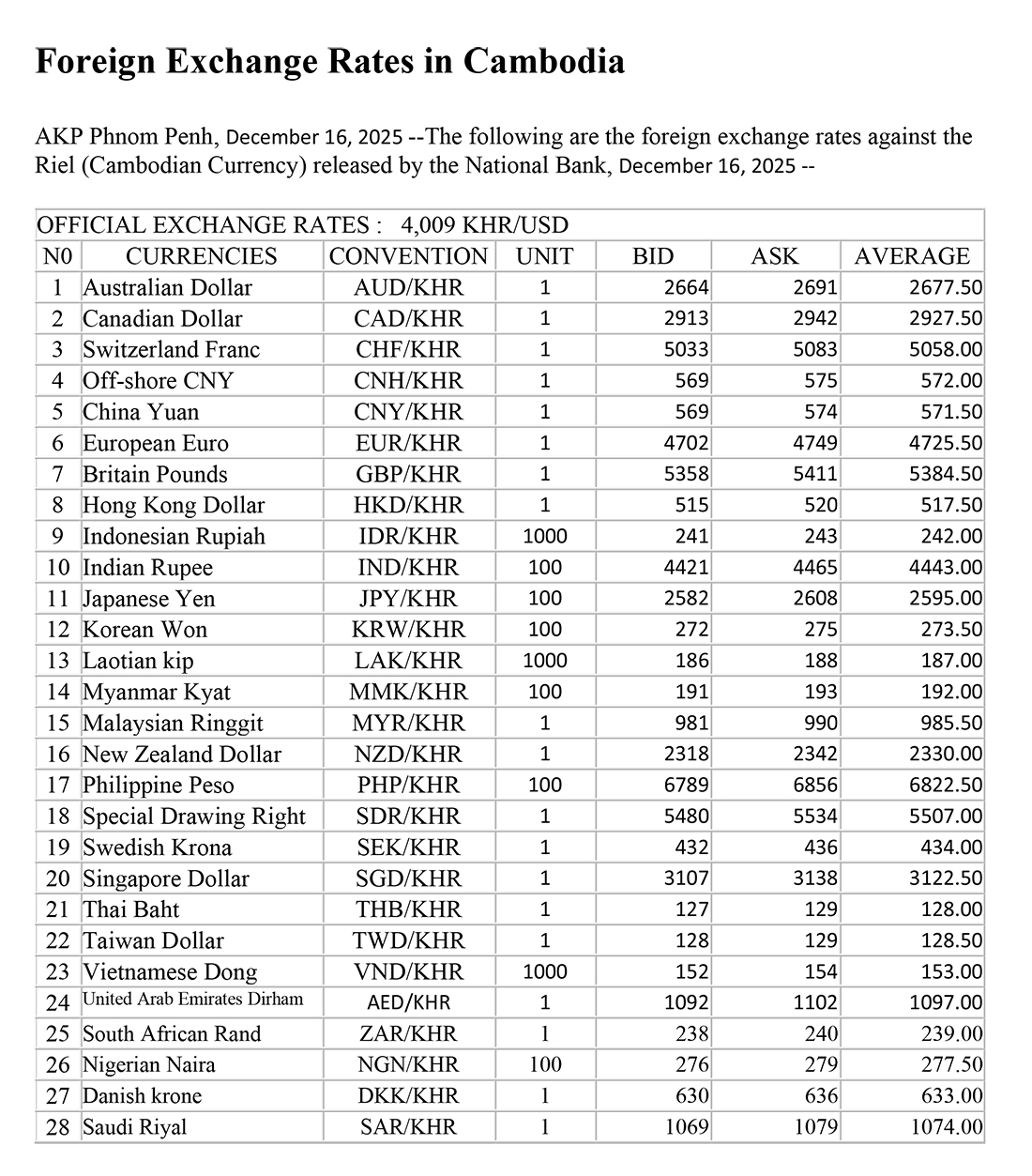 AKP Phnom Penh, December 16, 2025 --The following are the foreign exchange rates against the Riel (Cambodian Currency) released by the National Bank, December 16, 2025 --