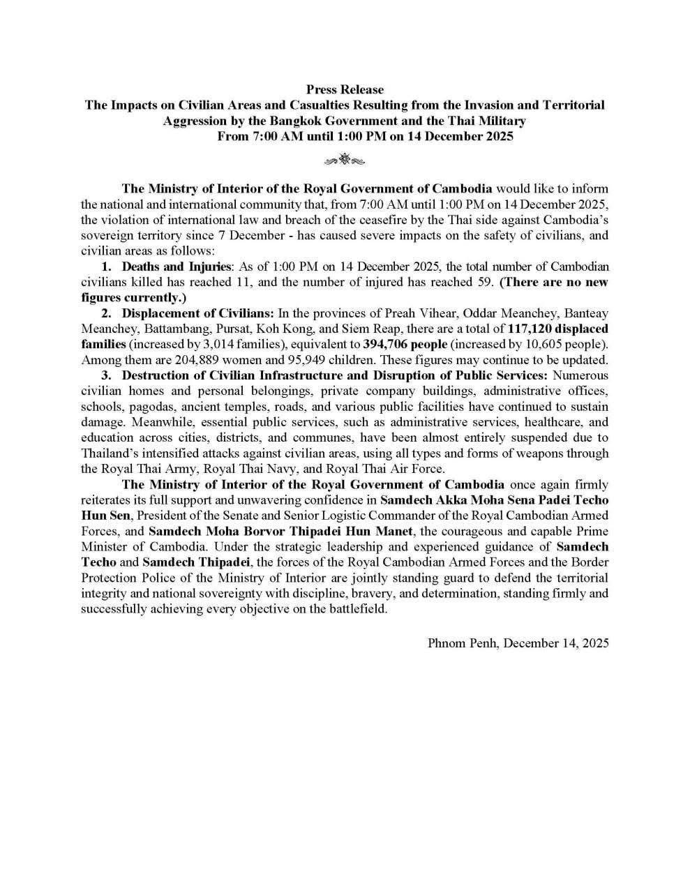 AKP Phnom Penh, December 14, 2025 -- The Ministry of Interior of the Royal Government of Cambodia this afternoon issues a press release regarding the impacts on civilian areas and casualties resulting from the invasion and territorial aggression by the Bangkok Gove...