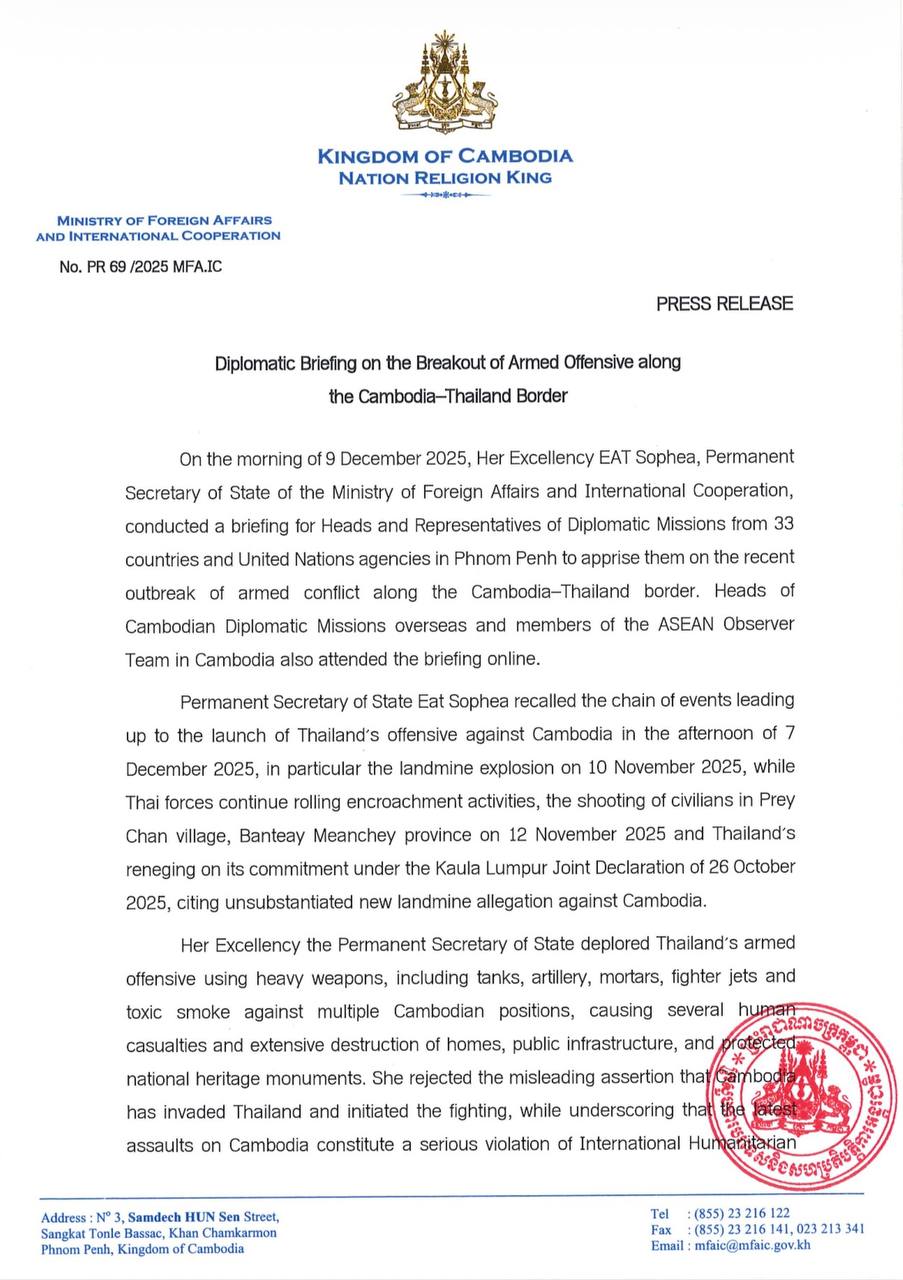 AKP Phnom Penh, December 10, 2025-- The Permanent Secretary of State of the Ministry of Foreign Affairs and International Cooperation H.E. Mrs. Eat Sophea deplored Thailand's armed offensive using heavy weapons on Cambodia’s territory. Speaking at the briefi...