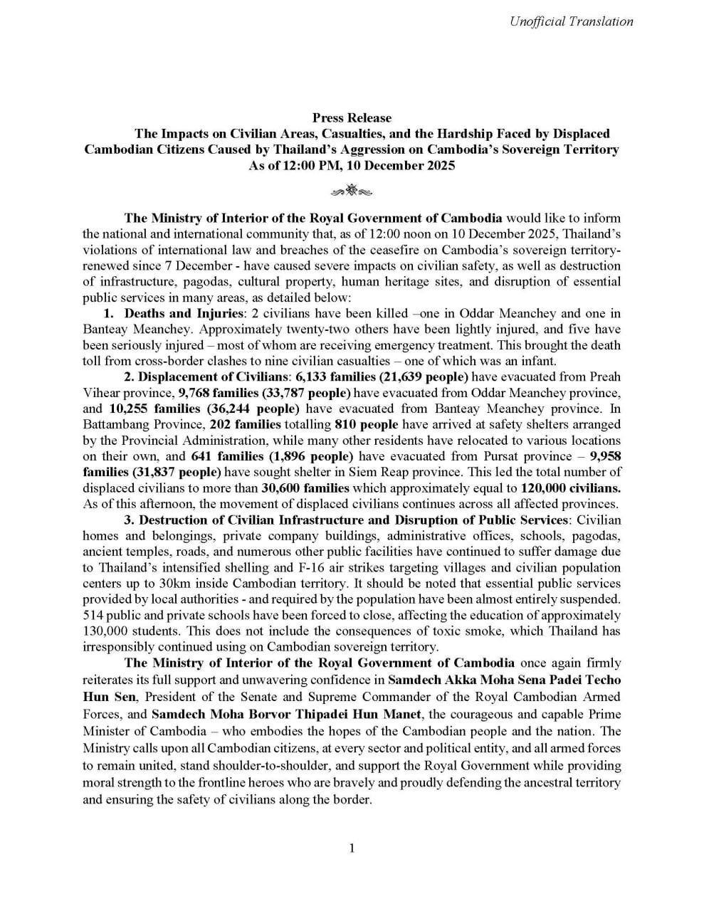 AKP Phnom Penh, December 10, 2025 -- The Ministry of Interior has issued a press statement regarding the impacts on civilian areas, civilian casualties, and the hardships faced by displaced citizens resulting from Thailand’s acts of aggression against Cambodia’s sove...