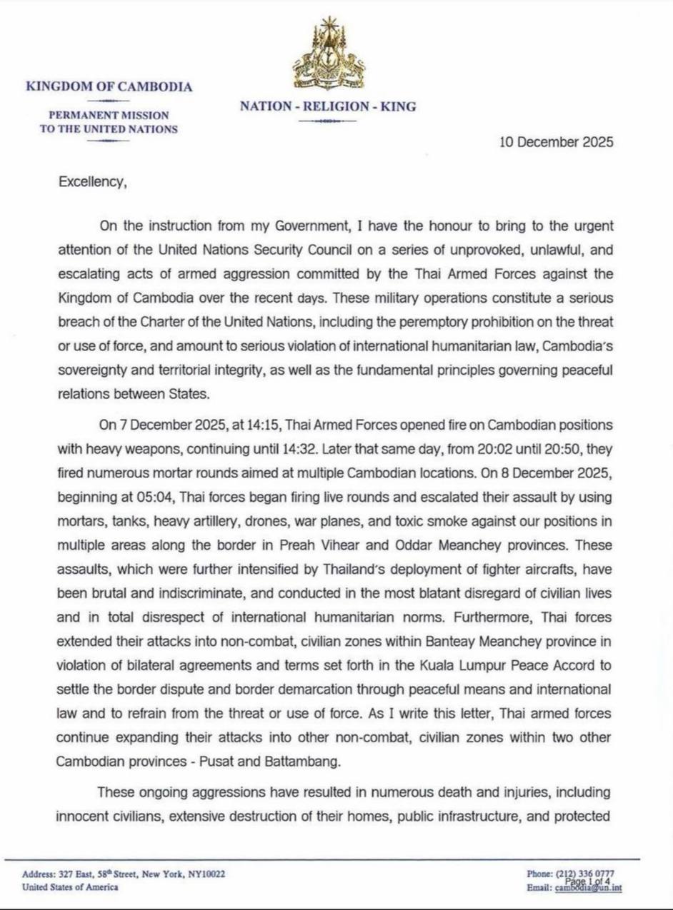 Cambodian Permanent Representative’s Letter to UN Security Council President on Thailand’s Aggression against Cambodia