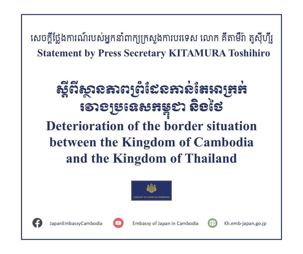 AKP Phnom Penh, December 08, 2025 -- The Press Secretary of Japan H.E. KITAMURA Toshihiro has issued a three-point statement on the deterioration of the border situation between the Kingdom of Cambodia and the Kingdom of Thailand. The full statement made public th...