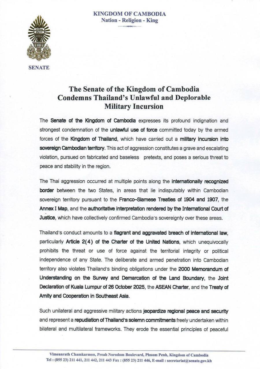 Cambodian Senate Condemns Thailand’s Unlawful and Deplorable Military Incursion