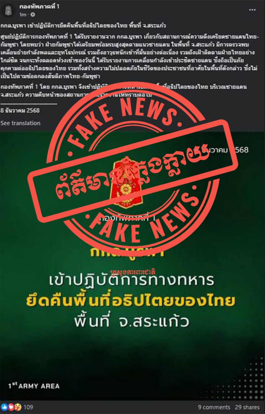 Cambodia Responds to False Information Posted by Thailand’s First Army Area Official Page