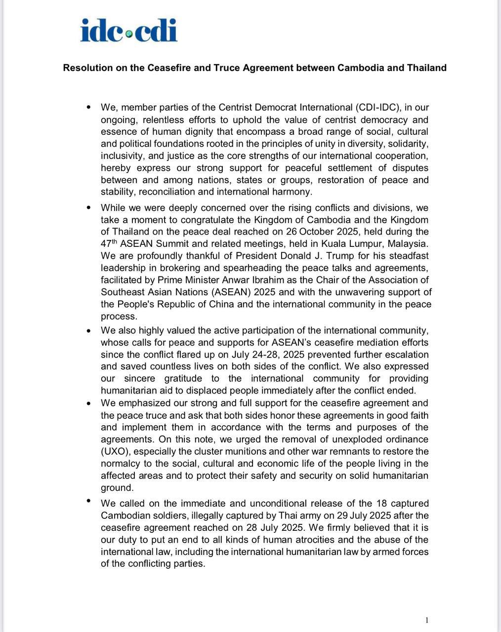 AKP Phnom Penh, November 24, 2025 -- The Centrist Democrat International (CDI-IDC) has adopted a five-point "Resolution on the Ceasefire and Truce Agreement between Cambodia and Thailand," at its Executive Committee Meeting and General Assembly, held in São Paulo, Br...