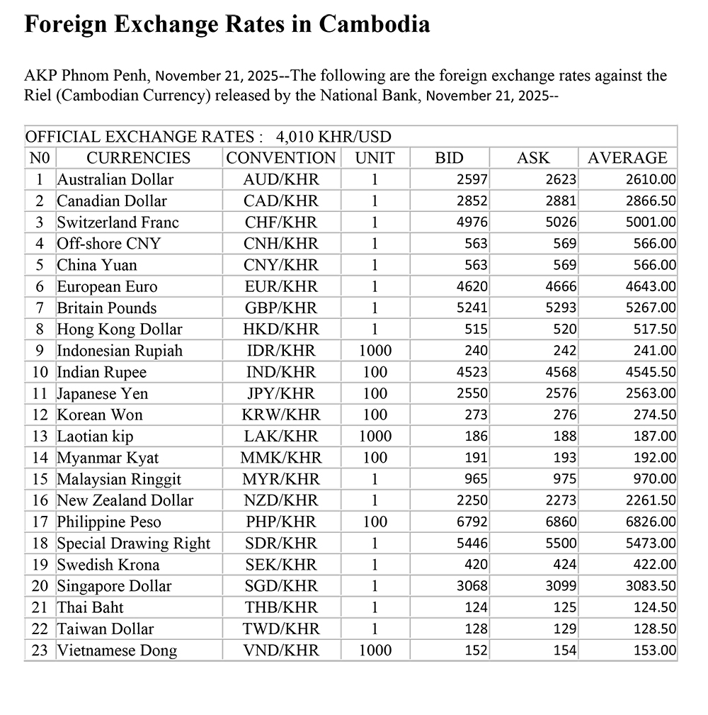 AKP Phnom Penh, November 21, 2025--The following are the foreign exchange rates against the Riel (Cambodian Currency) released by the National Bank, November 21, 2025--