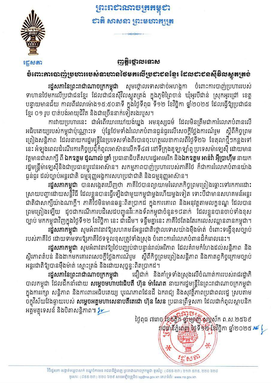 AKP Phnom Penh, November 12, 2025 -- The National Assembly of the Kingdom of Cambodia has issued a strong condemnation following a deadly incident where Thai soldiers reportedly opened fire on Cambodian civilians near the border, calling the act a "brutal, barb...