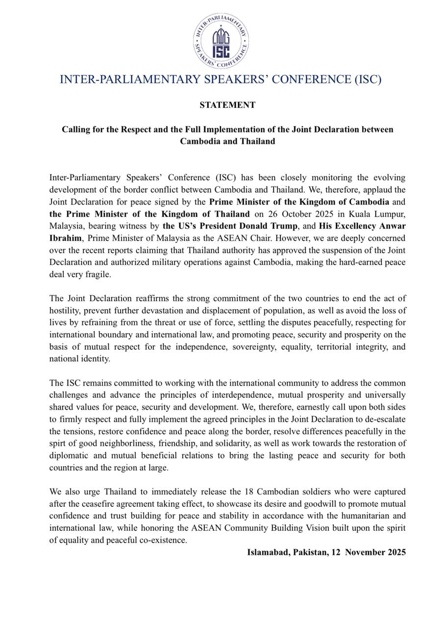 AKP Phnom Penh, November 12, 2025 -- The Inter-Parliamentary Speakers’ Conference (ISC) this evening issued a statement calling for respect and full implementation of the Joint Declaration between Cambodia and Thailand. The full statement reads as follows:...