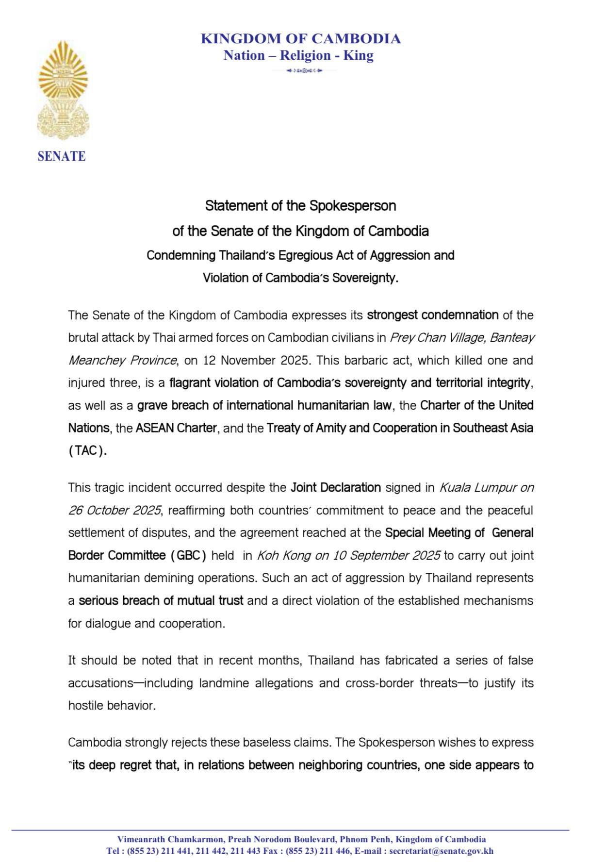AKP Phnom Penh, November 13, 2025 -- The Spokesperson of the Senate of the Kingdom of Cambodia this morning issued a statement, expressing its strongest condemnation of the brutal attack by Thai armed forces on Cambodian civilians in Prey Chan village, Banteay Meanc...