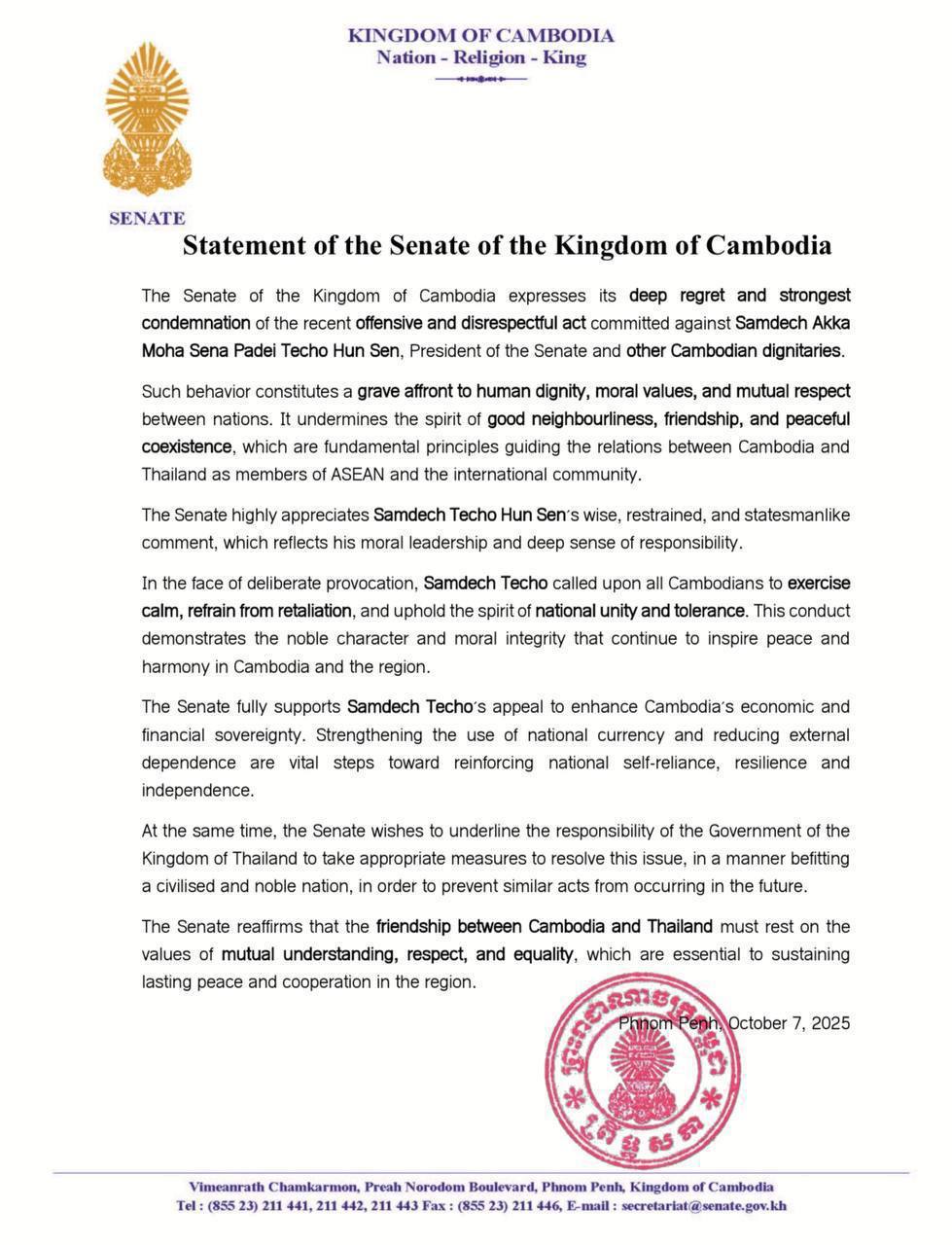 Senate of Cambodia Condemns Offensive Act Against Samdech Techo Hun Sen and Other Dignitaries