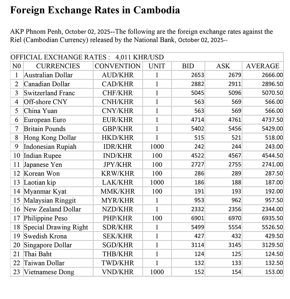 AKP Phnom Penh, October 02, 2025--The following are the foreign exchange rates against the Riel (Cambodian Currency) released by the National Bank, October 02, 2025--