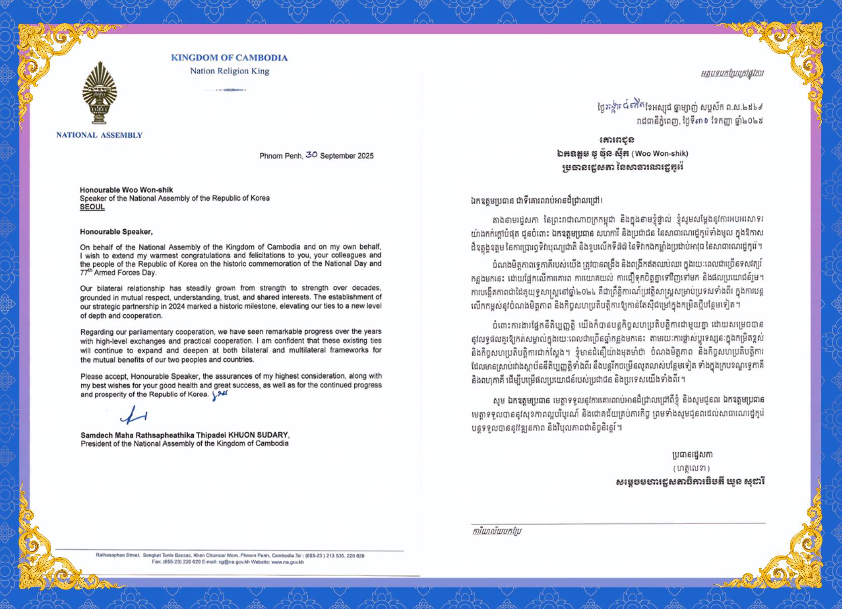 AKP Phnom Penh, October 01, 2025 -- Samdech Maha Rathsapheathika Thipadei Khuon Sudary, President of the National Assembly of the Kingdom of Cambodia, has sent a congratulatory message to H.E. Woo Won-shik, Speaker of the National Assembly of the Republic of Korea, o...