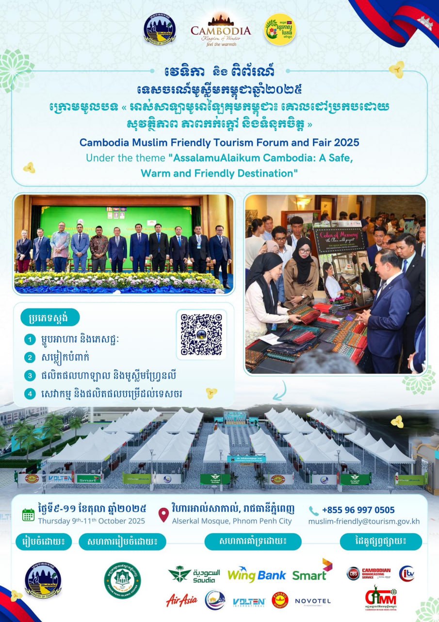 AKP Phnom Penh, September 29, 2025 -- The Ministry of Tourism will organise the “Cambodia Muslim Friendly Tourism Forum and Fair 2025” from Oct. 9 to 11 at Al-Serkal Mosque (Boeung Kak Mosque) in Phnom Penh under the theme “Assalamu Alaikum Cambodia: A Sa...