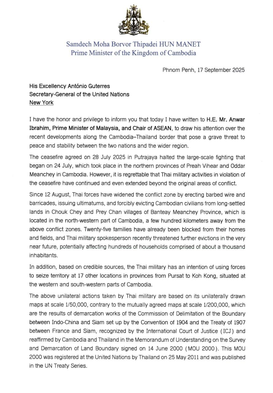 AKP Phnom Penh, September 18, 2025 -- Samdech Moha Borvor Thipadei Hun Manet, Prime Minister of the Kingdom of Cambodia, has sent a letter to H.E. António Guterres, Secretary-General of the United Nations, informing him about the recent developments along the Cambodi...