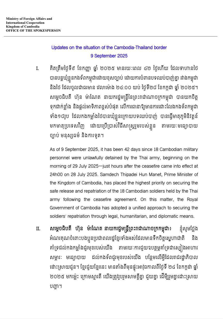 AKP Phnom Penh, September 10, 2025 -- The 18 Cambodian soldiers currently under the captivity of the Thai Military since July 29, 2025, after the ceasefire agreement had taken effect, are safe and in good health, confirmed the International Committee of the Red Cross...
