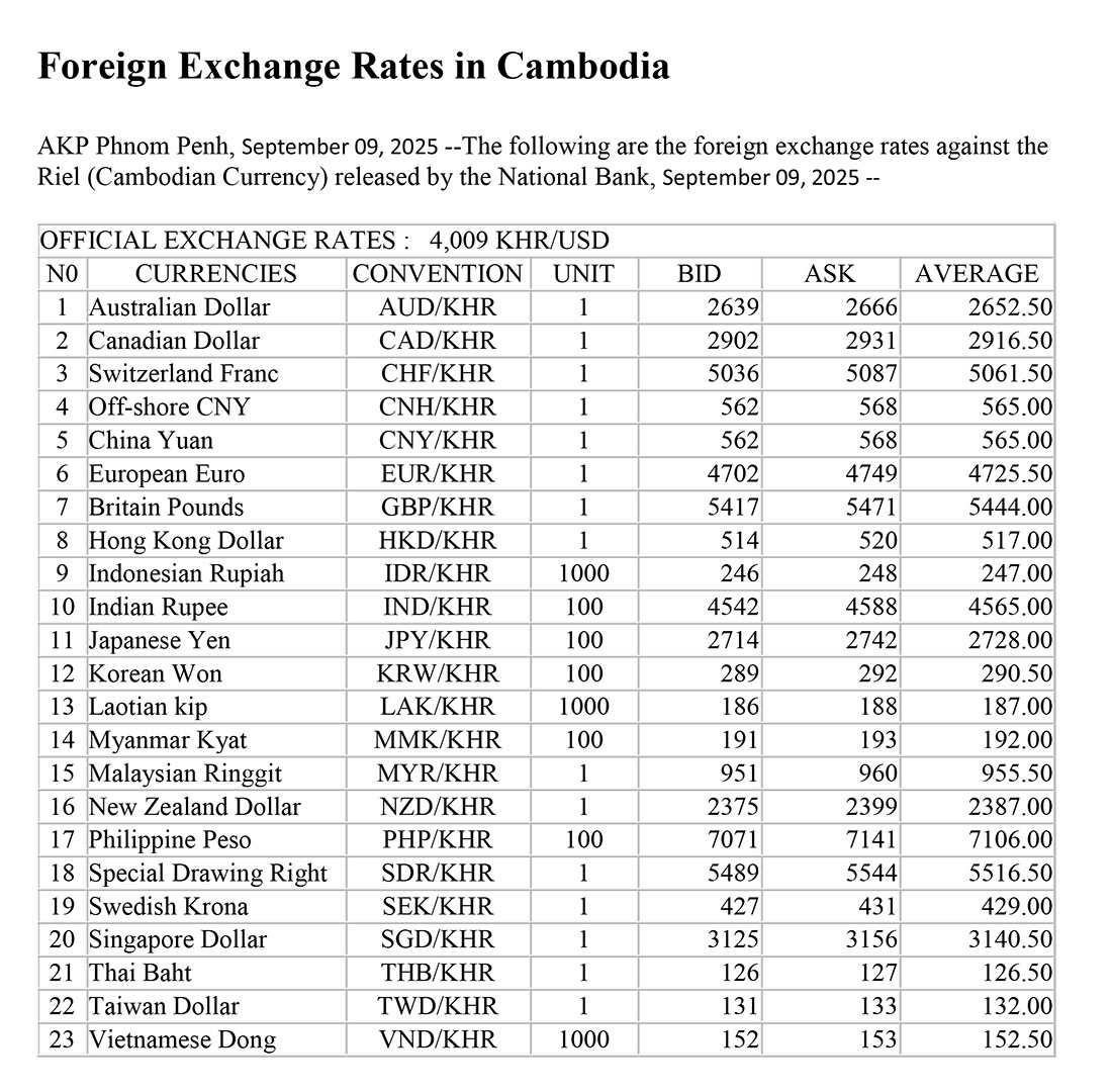 AKP Phnom Penh, September 09, 2025 --The following are the foreign exchange rates against the Riel (Cambodian Currency) released by the National Bank, September 09, 2025 --