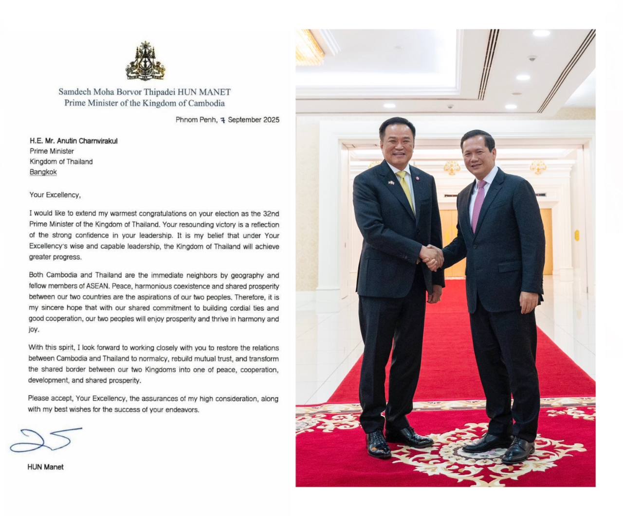 AKP Phnom Penh, September 07, 2025— Cambodian Prime Minister Samdech Moha Borvor Thipadei Hun Manet has offered his congratulations to Anutin Charnvirakul on his election as the 32nd Prime Minister of Thailand. In his message, Samdech Thipadei Hun Manet praised An...