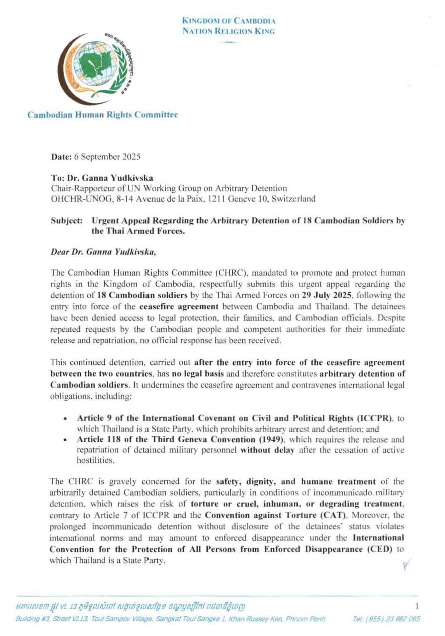 CHRC Sends Letter to Chair-Rapporteur of UN Working Group on Arbitrary Detention on Arbitrary Detention of Cambodian Soldiers by Thai Armed Forces