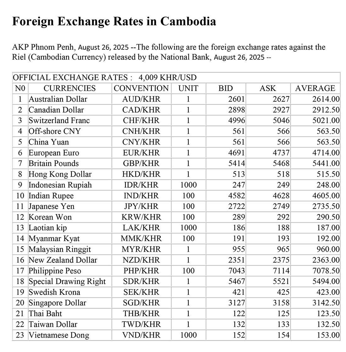 AKP Phnom Penh, August 26, 2025 --The following are the foreign exchange rates against the Riel (Cambodian Currency) released by the National Bank, August 26, 2025 --