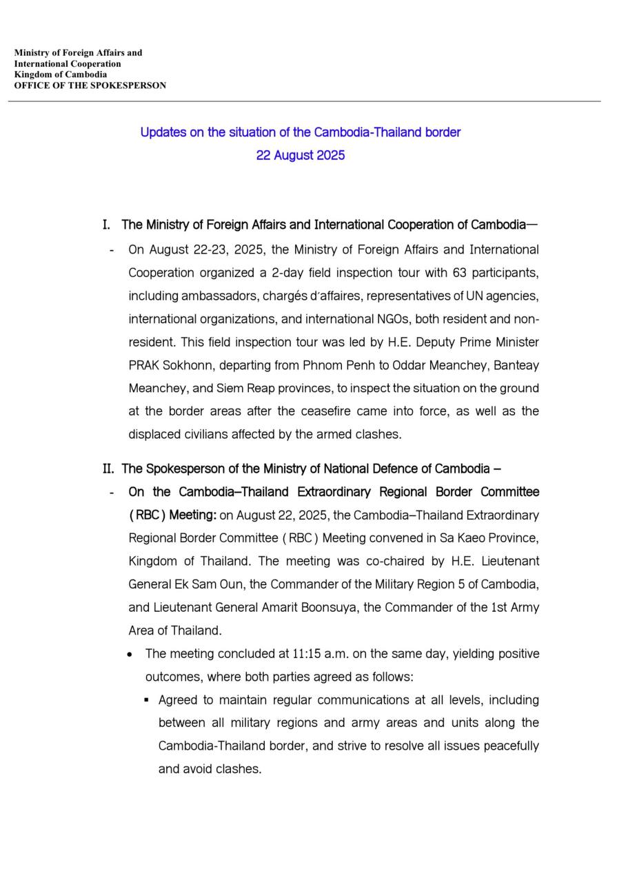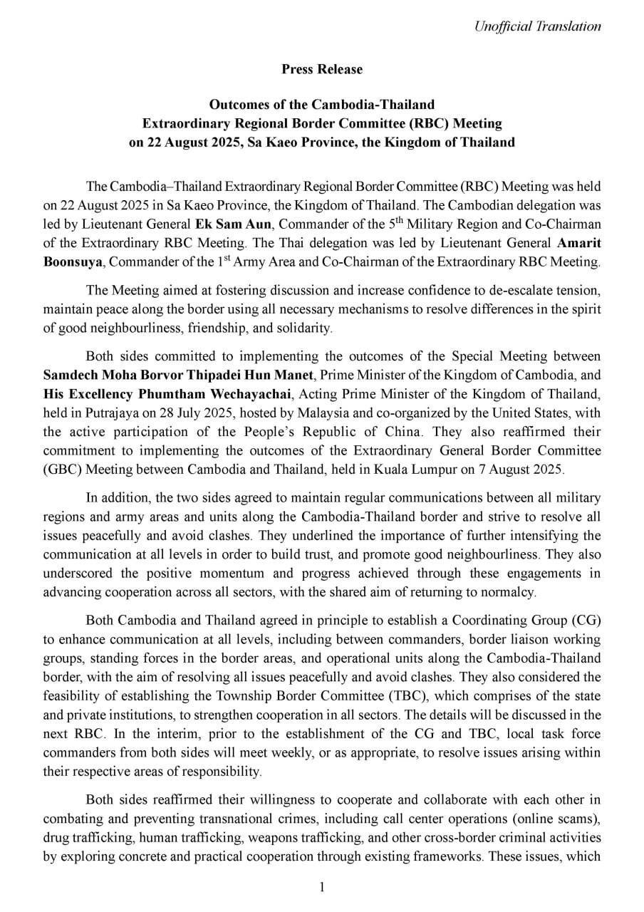 AKP Phnom Penh, August 22, 2025 -- The extraordinary meeting of the Cambodia-Thailand Regional Border Committee (RBC) between Cambodia's 5th Military Region and Thailand's 1st Army Area was held this morning in the Thai province of Sa Kaeo. The Cambodian delegatio...