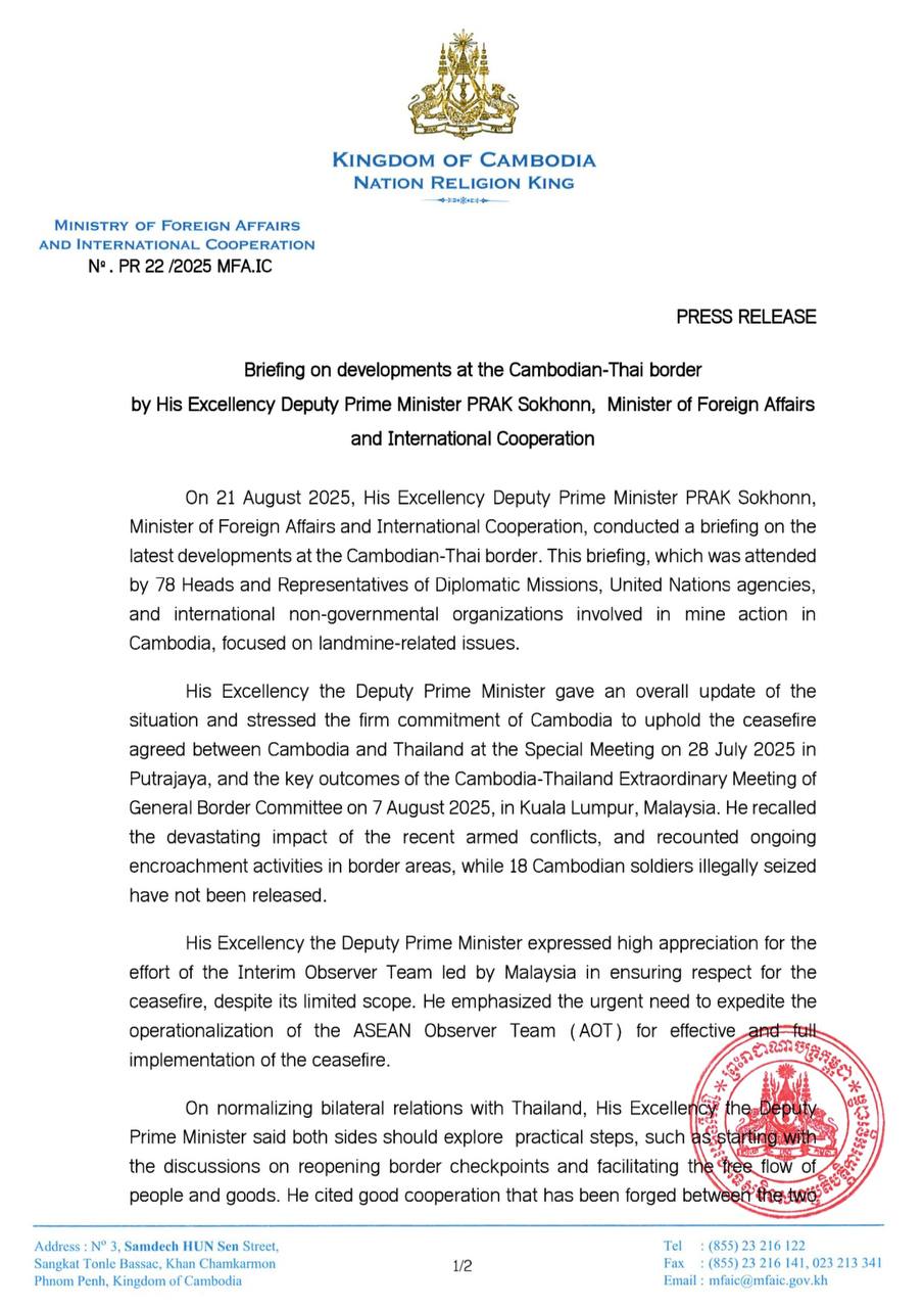 Briefing on Developments at Cambodian-Thai Border by DPM PRAK Sokhonn, Minister of Foreign Affairs and International Cooperation