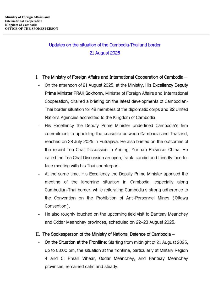Updates on Situation along Cambodia-Thailand Border on Aug. 21