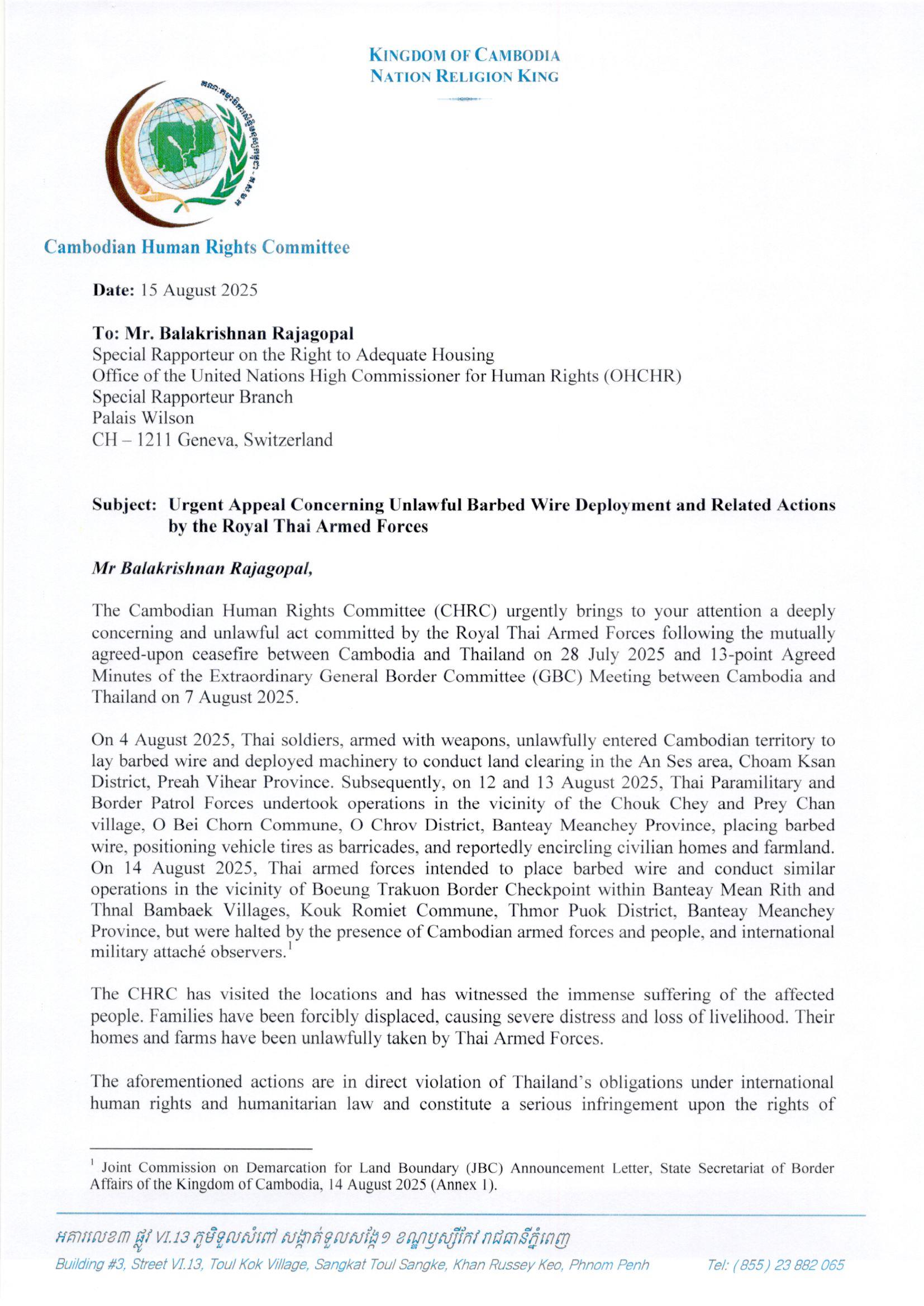 AKP Phnom Penh, August 15, 2025 -- H.E. Keo Remy, President of the Cambodian Human Rights Committee (CHRC), has lodged separate urgent appeals to the Special Rapporteur on the Rights to Adequate Housing of the Office of the United Nations High Commissioner for Human Rig...