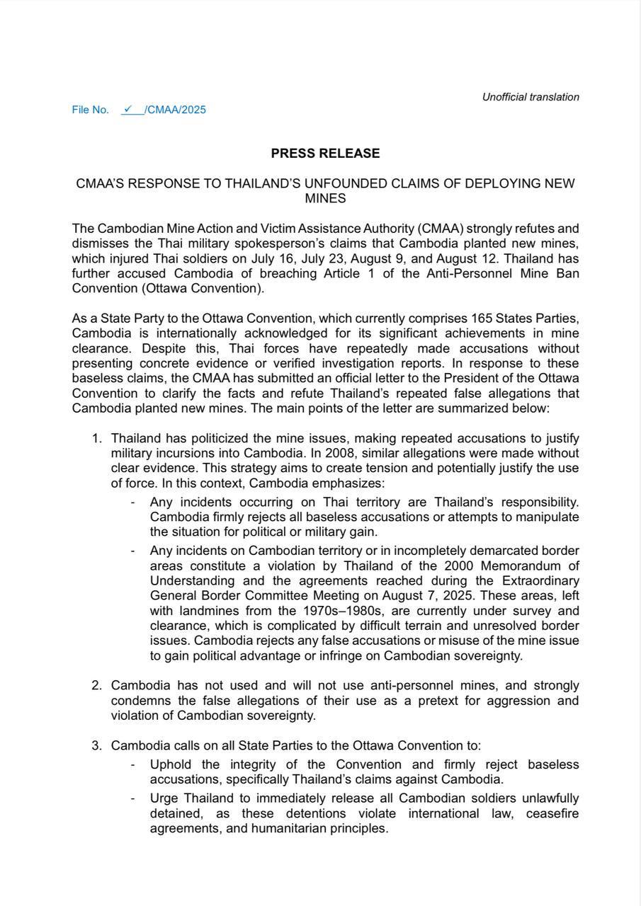 AKP Phnom Penh, August 15, 2025 -- The Cambodian Mine Action and Victim Assistance Authority (CMAA) has firmly dismissed Thailand’s unfounded accusation that Cambodia breached the Ottawa Convention by planting new mines. The full press release issued on Aug....
