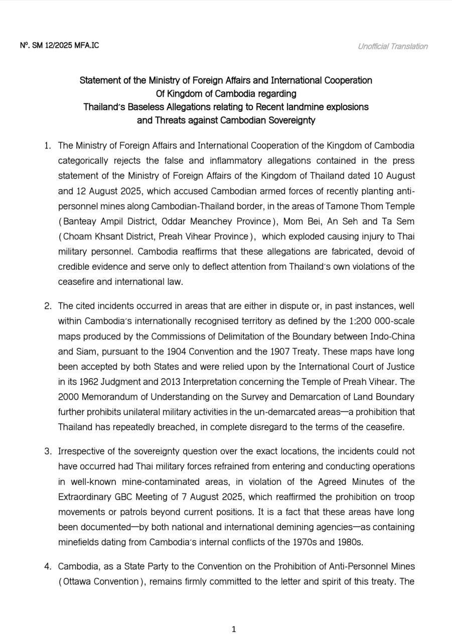 AKP Phnom Penh, August 13, 2025 -- Cambodia’s Ministry of Foreign Affairs has issued a statement regarding Thailand’s baseless allegations relating to recent landmine explosions and threats against Cambodian sovereignty. The full statement made public this evening re...
