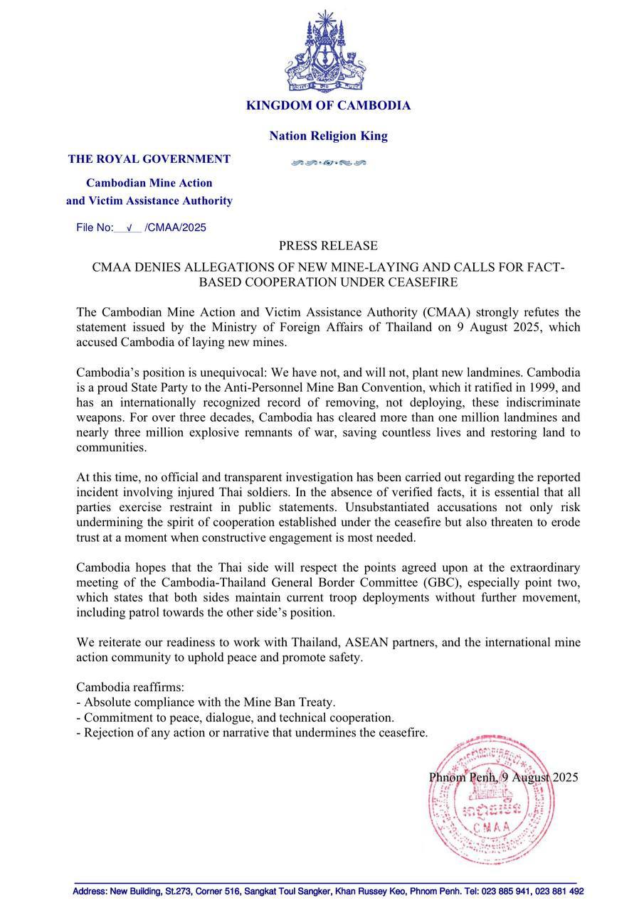 AKP Phnom Penh, August 09, 2025 -- The Cambodian Mine Action and Victim Assistance Authority (CMAA) has strongly refuted the statement issued by the Ministry of Foreign Affairs of Thailand on Aug. 9, which accused Cambodia of laying new mines. In its press relea...