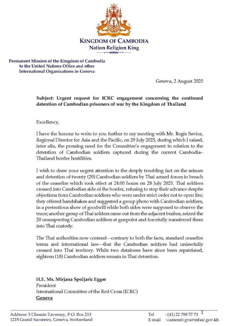 AKP Phnom Penh, August 06, 2025 -- The Permanent Mission of Cambodia to the United Nations Office and other International Organisations in Geneva, has sent letters to President of International Committee of the Red Cross (ICRC) and the United Nations High Commissio...