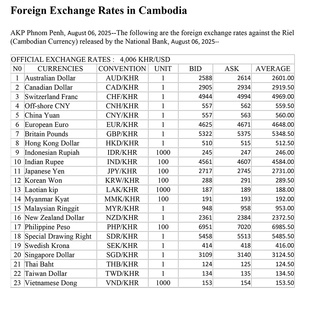 AKP Phnom Penh, August 06, 2025--The following are the foreign exchange rates against the Riel (Cambodian Currency) released by the National Bank, August 06, 2025--