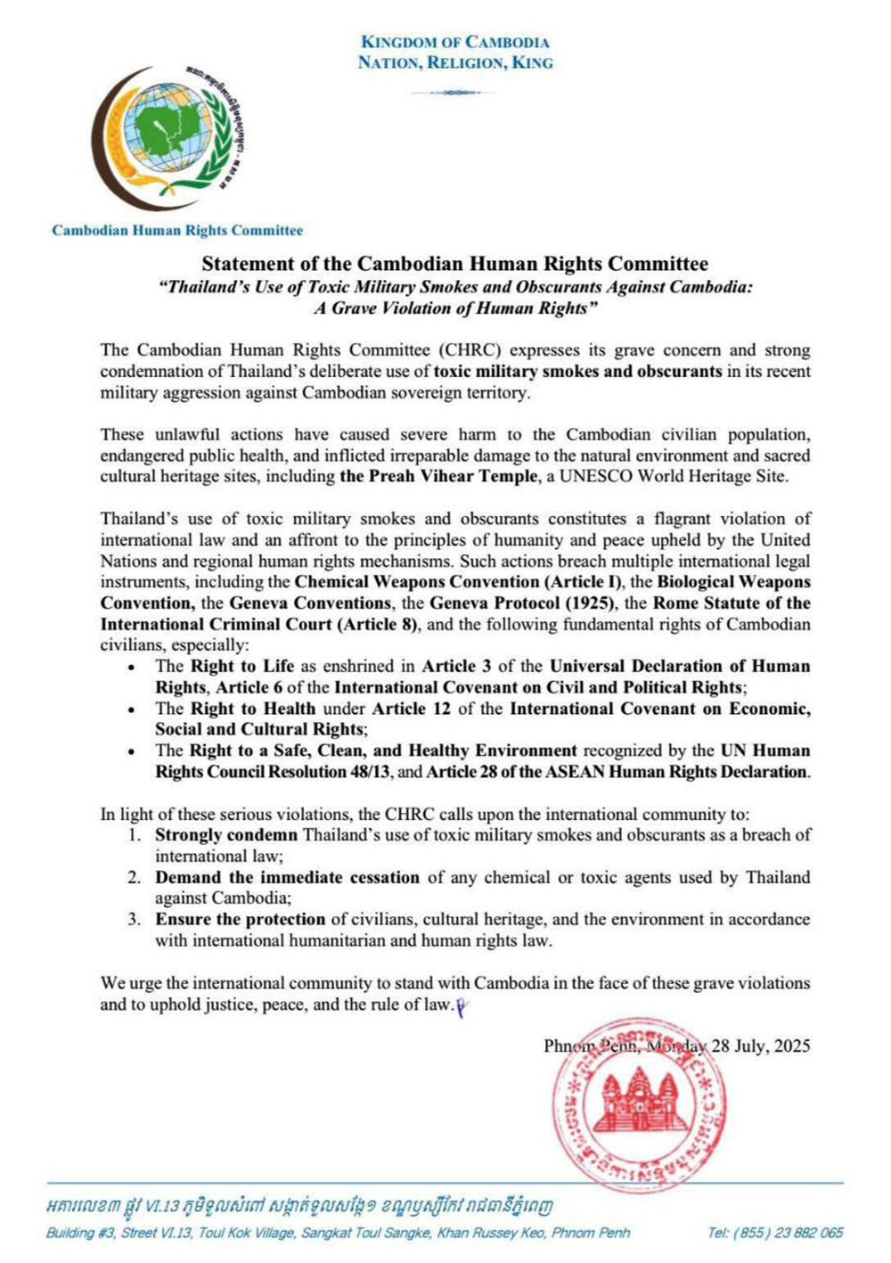 AKP Phnom Penh, July 28, 2025 -- The Cambodian Human Rights Committee (CHRC) has in a statement expressed its grave concern and strong condemnation of Thailand's deliberate use of toxic military smokes and obscurants in its recent military aggression against Cambodia...