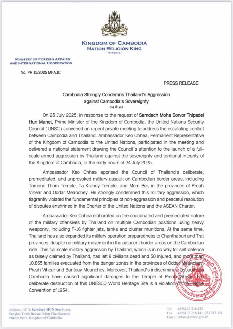 AKP Phnom Penh, July 26, 2025 -- The following is the statement of H.E. Chhea Keo, Ambassador and Permanent Representative of the Kingdom of Cambodia to the United Nations, at the Security Council on Thai Aggression against Cambodia’s Territory, under Agenda item "Threa...