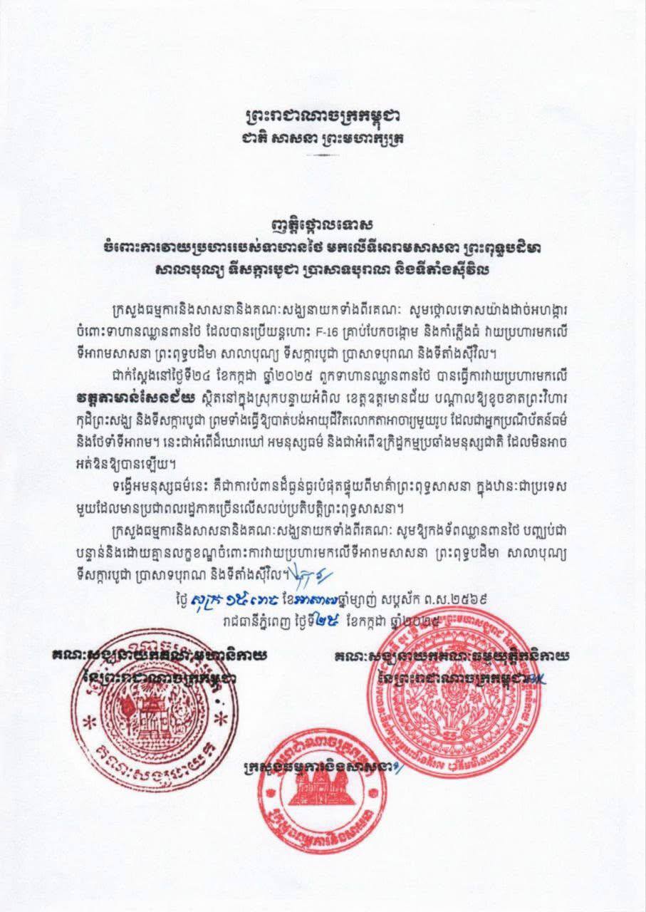 Petition for Condemnation for Attacks by Thai Soldiers on Monasteries, Buddha Statues, Buddhism Hall, Ancient Temples, Places of Worship, and Civilian Sites