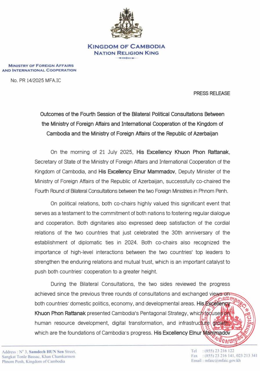 AKP Phnom Penh, July 25, 2025 -- The following are the outcomes of the Fourth Session of the Bilateral Political Consultations between the Ministry of Foreign Affairs and International Cooperation of the Kingdom of Cambodia (MFAIC) and the Ministry of Foreign Affairs...