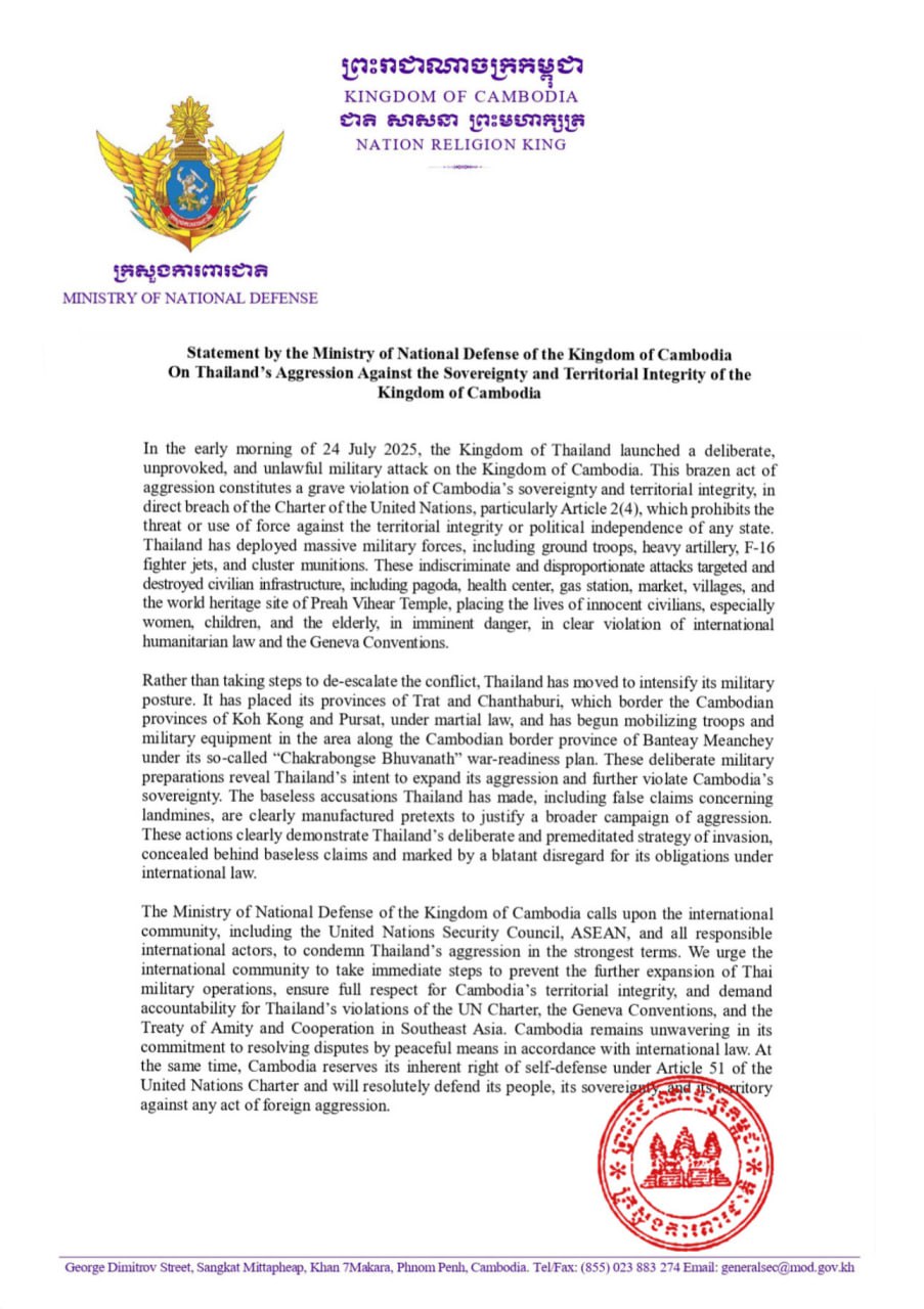 Statement by the Ministry of National Defence on Thailand’s Aggression Against the Sovereignty and Territorial Integrity of Cambodia